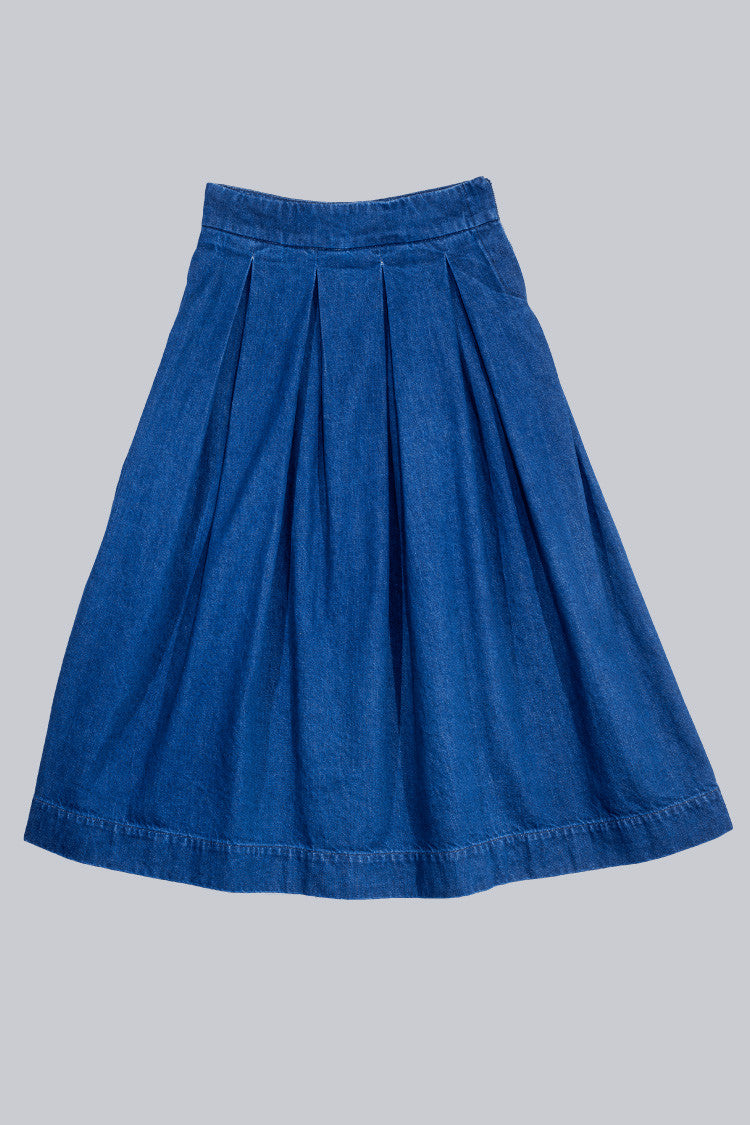 Theodora midi skirt in blue denim.
