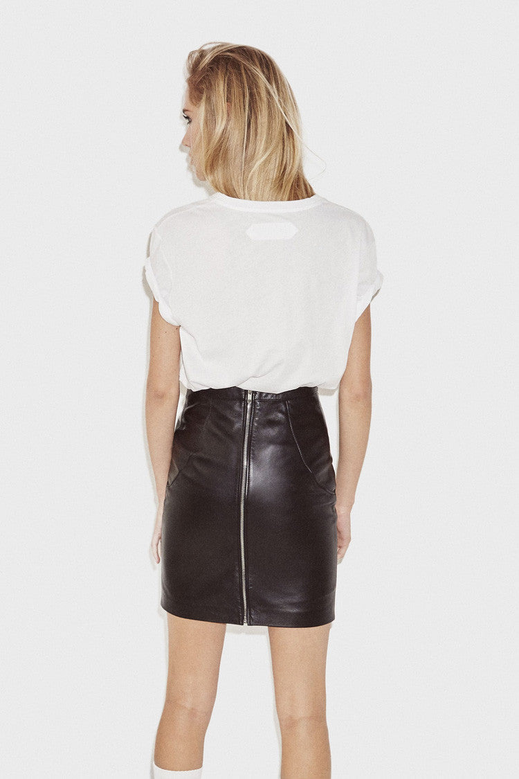 Claire is wearing Tee-shirt N°26 in size S with the Barisson leather skirt, and is 1.72m tall.