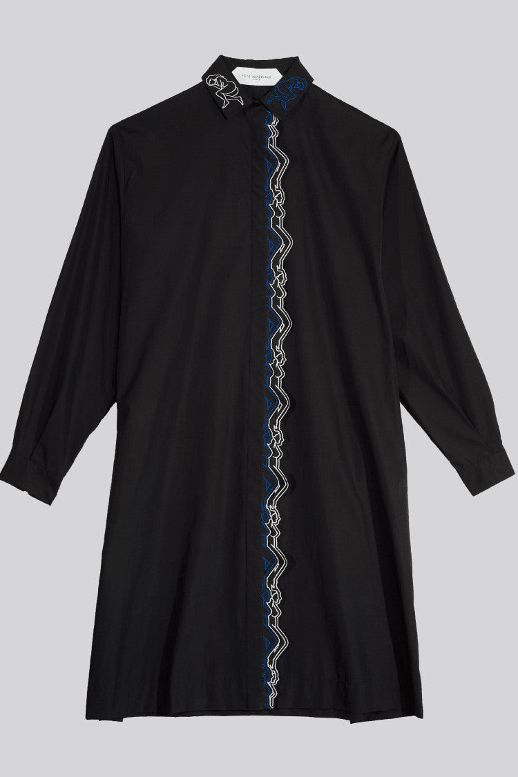 Astrid oversized shirt cotton dress. “Nus” theme embroidery placed on the collar and the placket.
