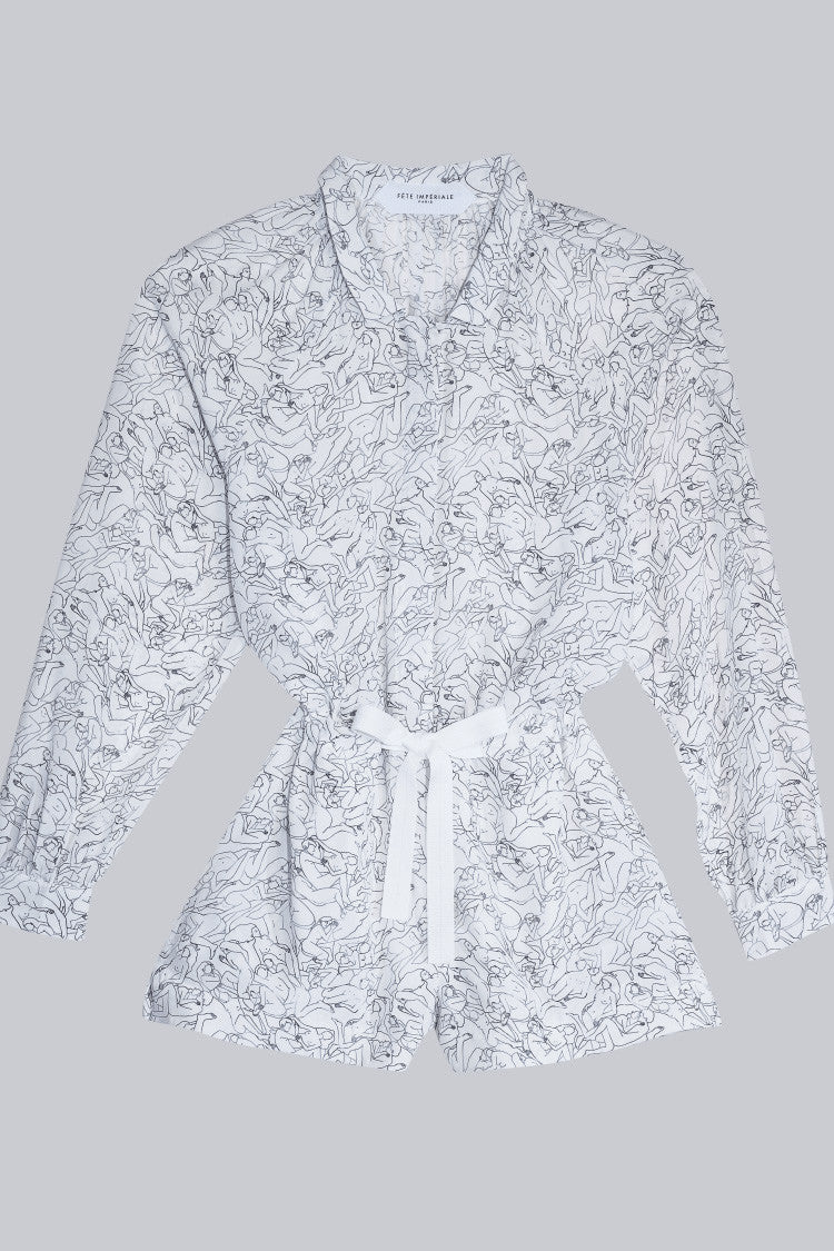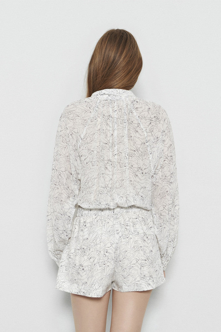 Judith silk playsuit in French silk. Hand-drawn “Nudes” theme. Long sleeves and link to tighten the waist.