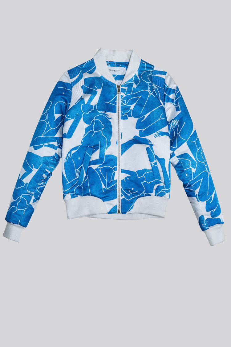 Lea is wearing Frida with the Orbiane in “Géants bleus” print and the Faust white cropped top.