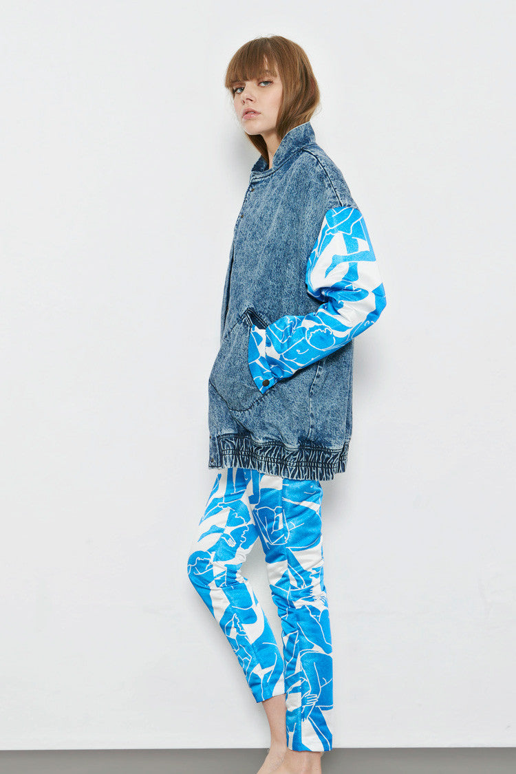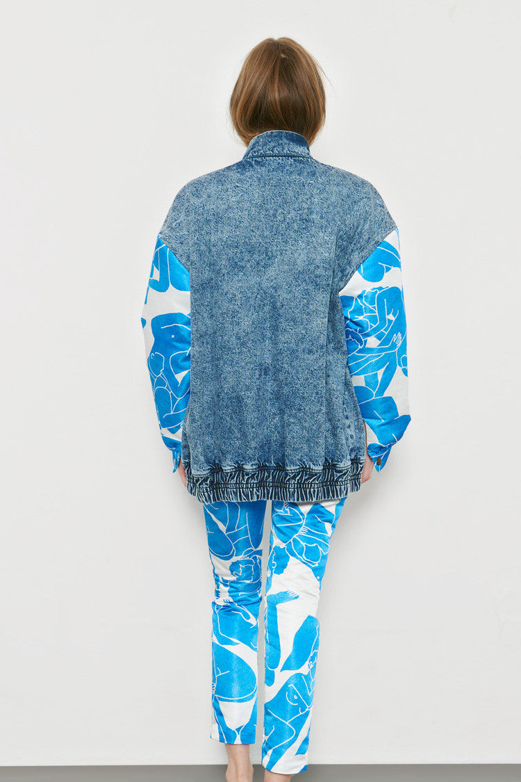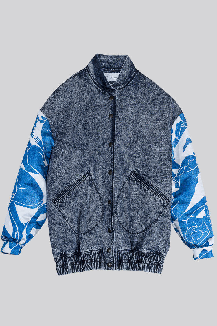Henry oversized denim teddy jacket with sleeves in our “Courtisanes & Polaroïde” print. Henry is also available with “Géants bleus” printed sleeves. All our prints have been designed by Fête Impériale Paris. Léa is wearing Henry in size 36 with the Angélique black dress, and is 1.76m tall.