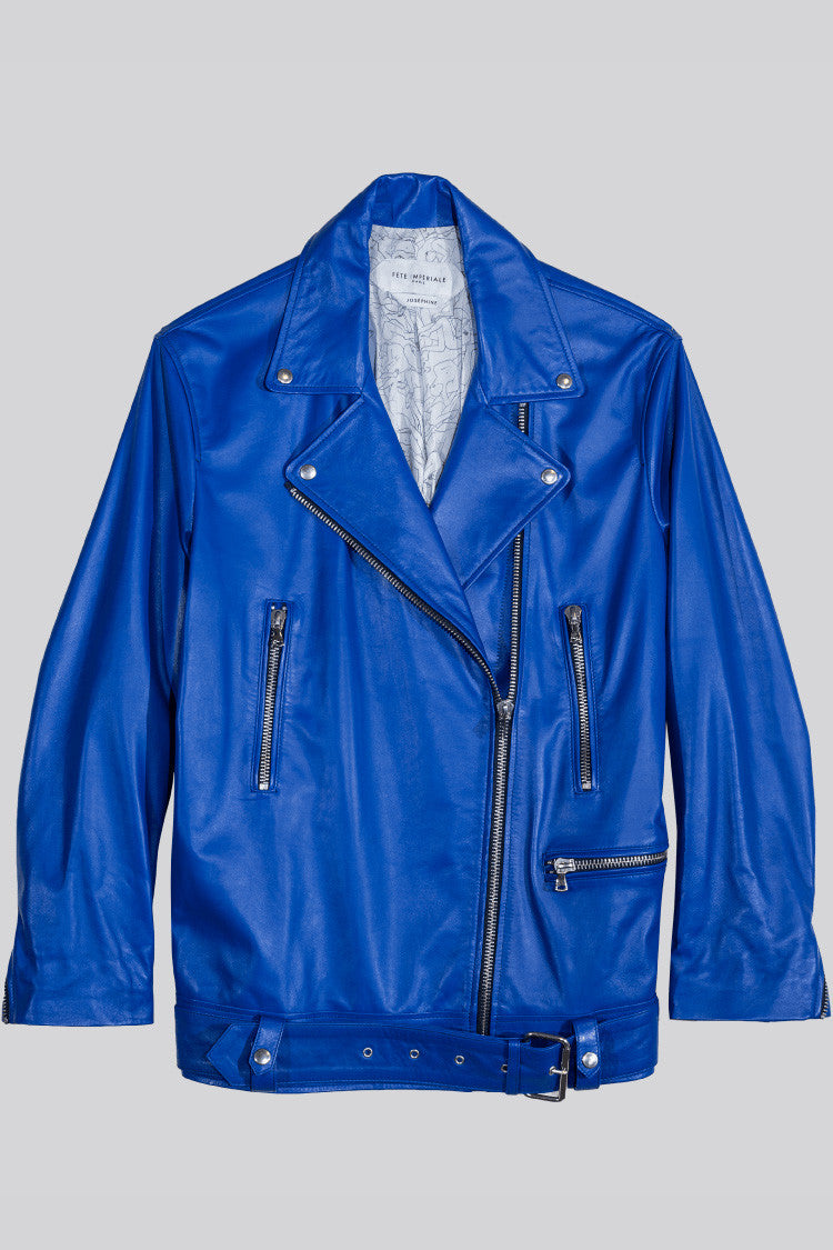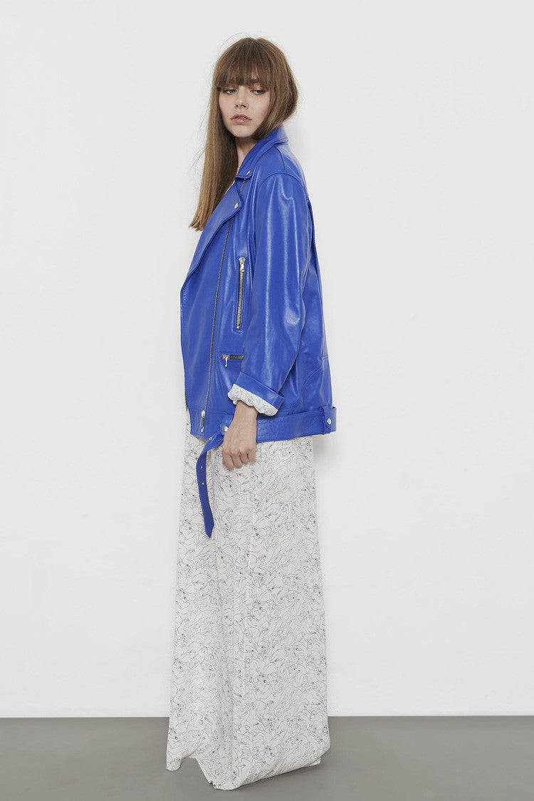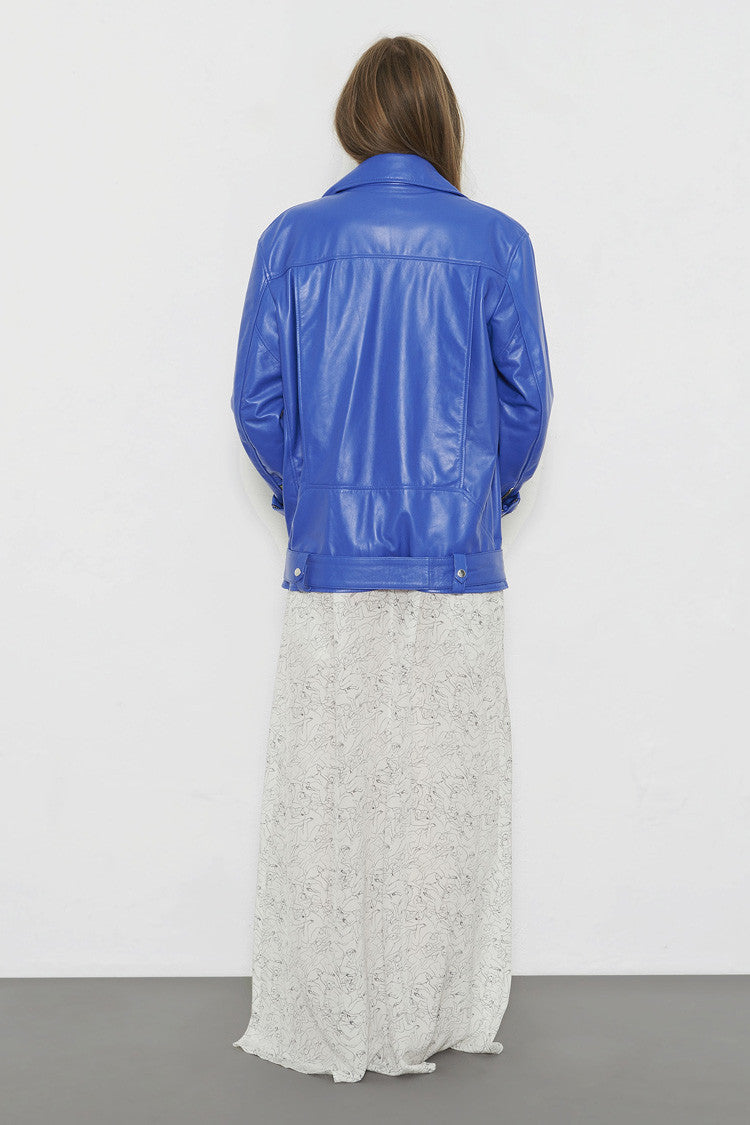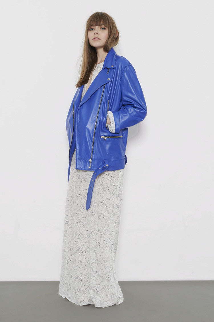 Joséphine Oversized leather jacket zipped slanted pockets and zipper with silvery finish.