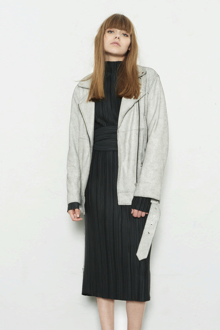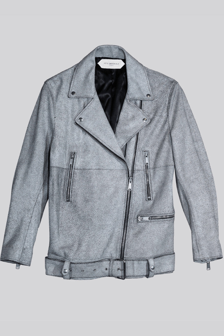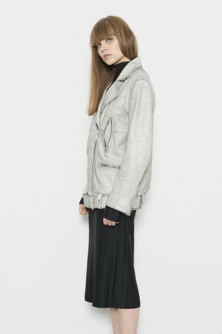 Joséphine oversized white cracked leather jacket with zipped slanted pockets and zipper with silvery finish.