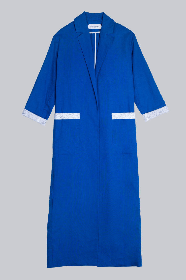 Raphaël oversized summer coat with “Nus” theme lining. Long straight cut with two patched pockets and belt.