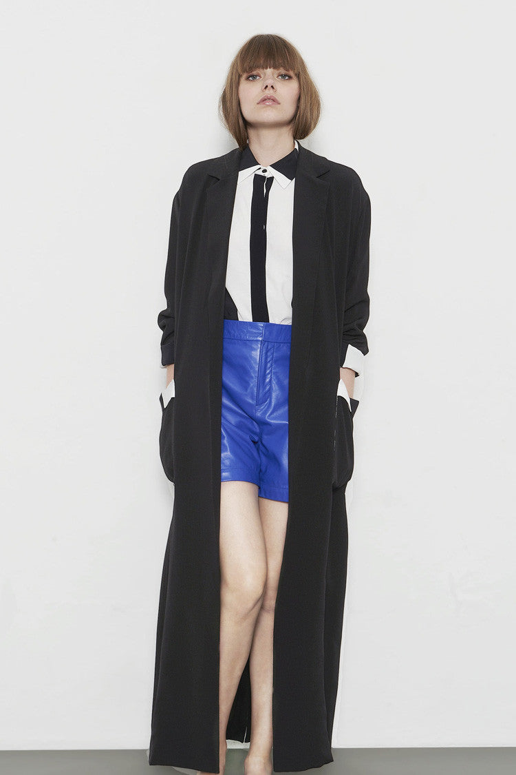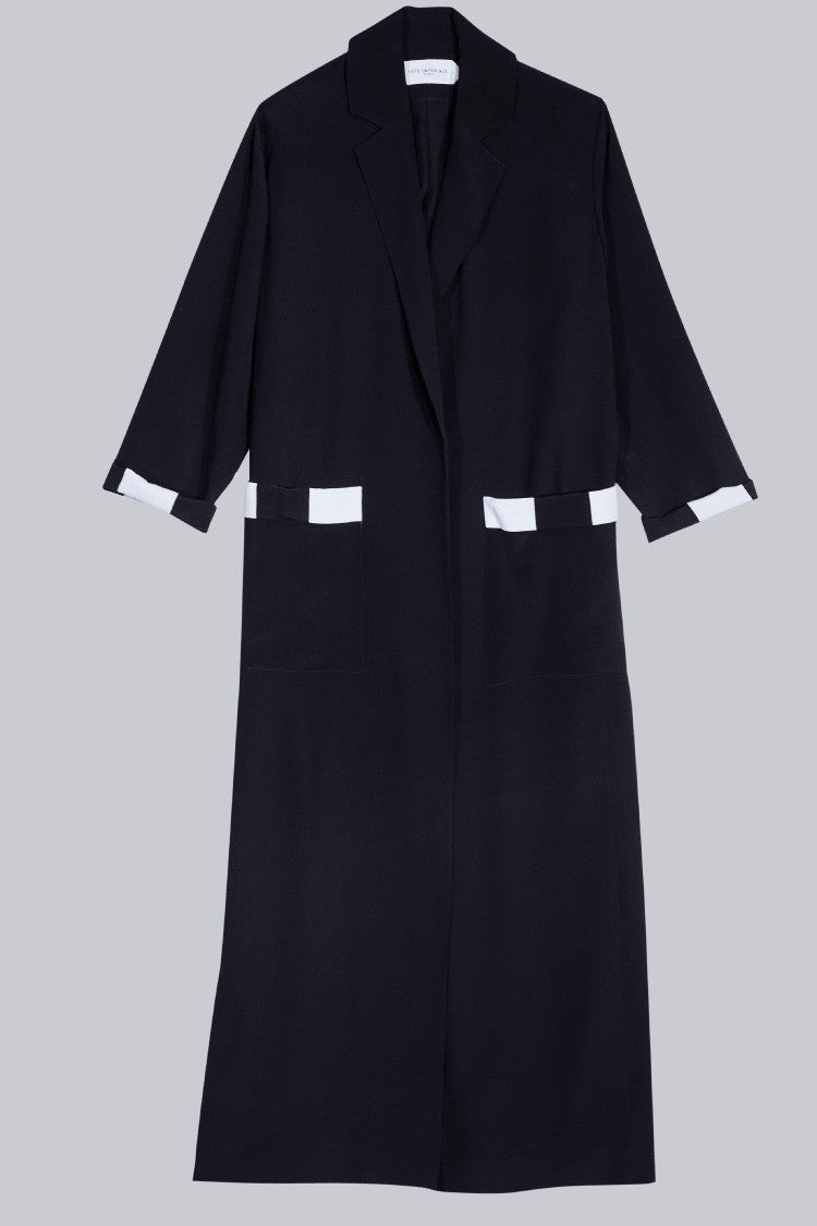 Raphaël oversized summer coat with “Bayadères” printed lining. Long straight cut with two patched pockets and belt.