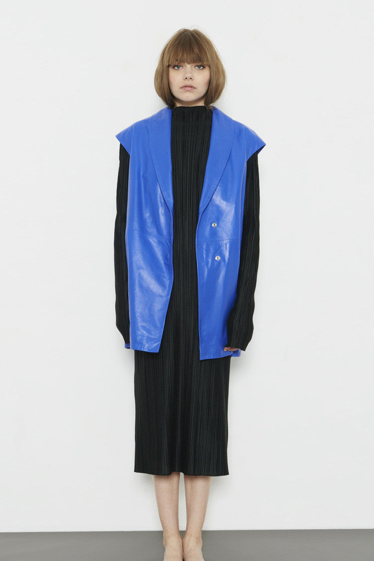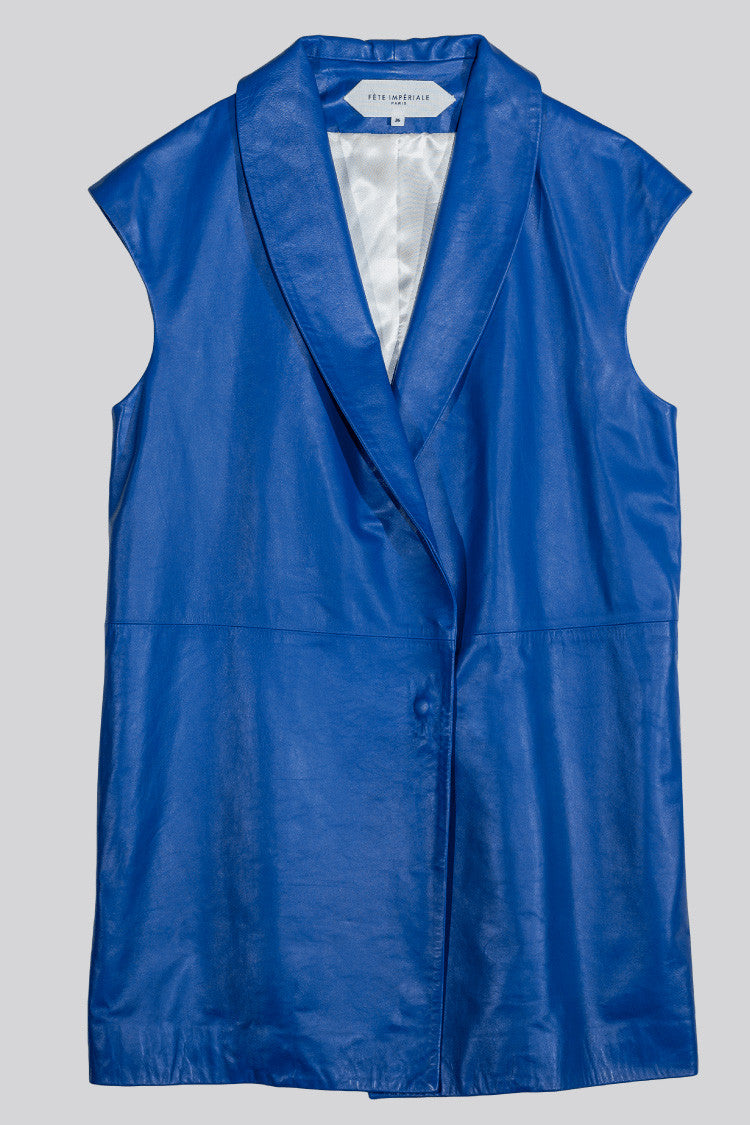 Aristote sleeveless leather jacket. Long blazer shape with snap closure.