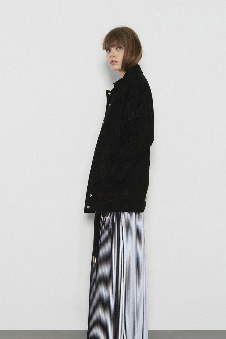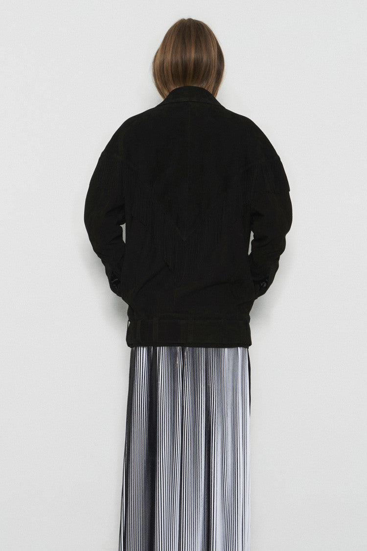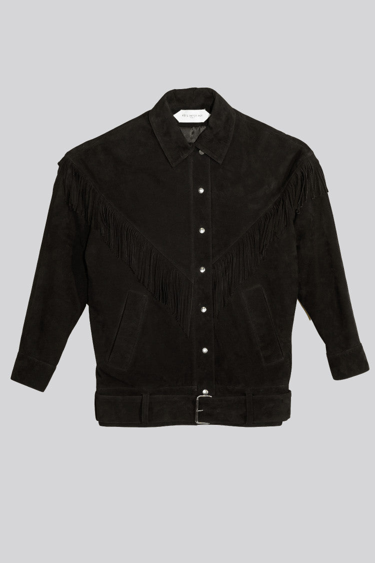 Auguste suede oversized jacket. Belted with fringes on the front and the back and metallic pressures.