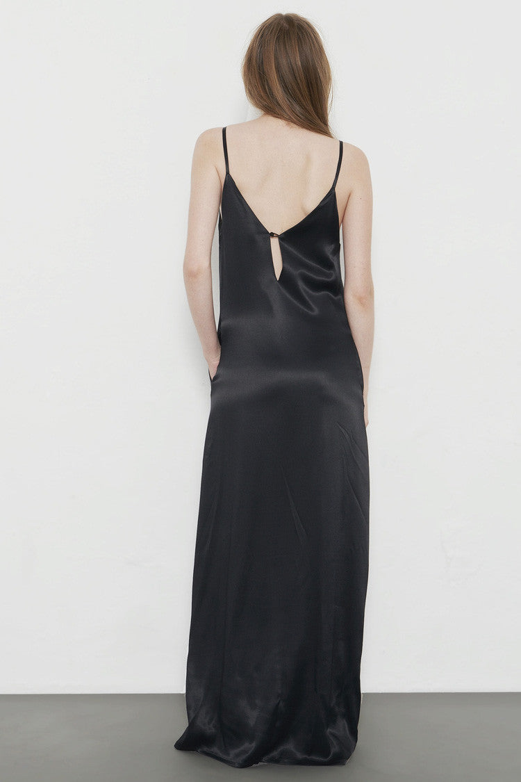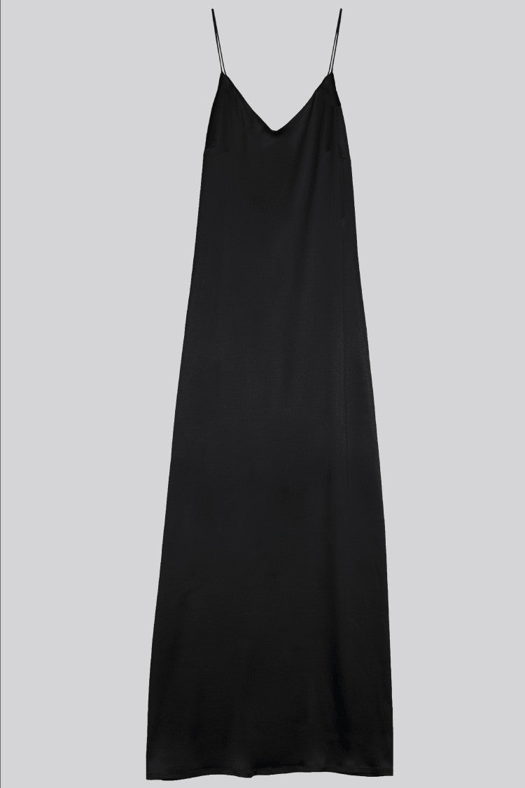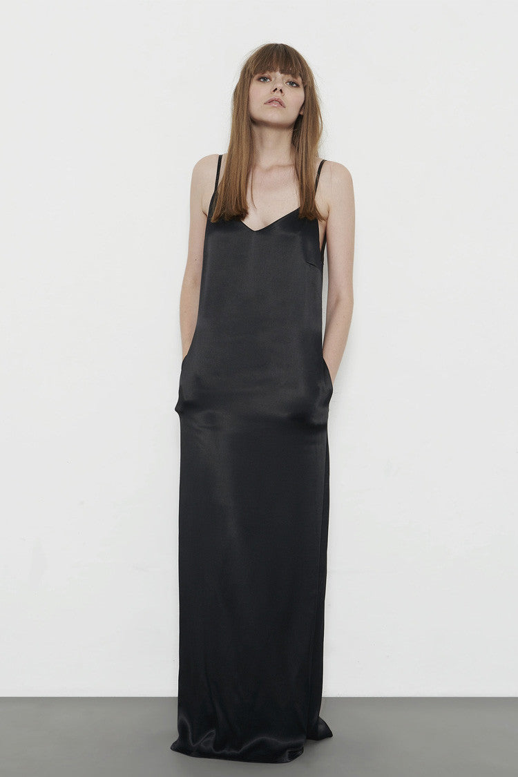 Angélique long satin dress. Thin straps and v neck.