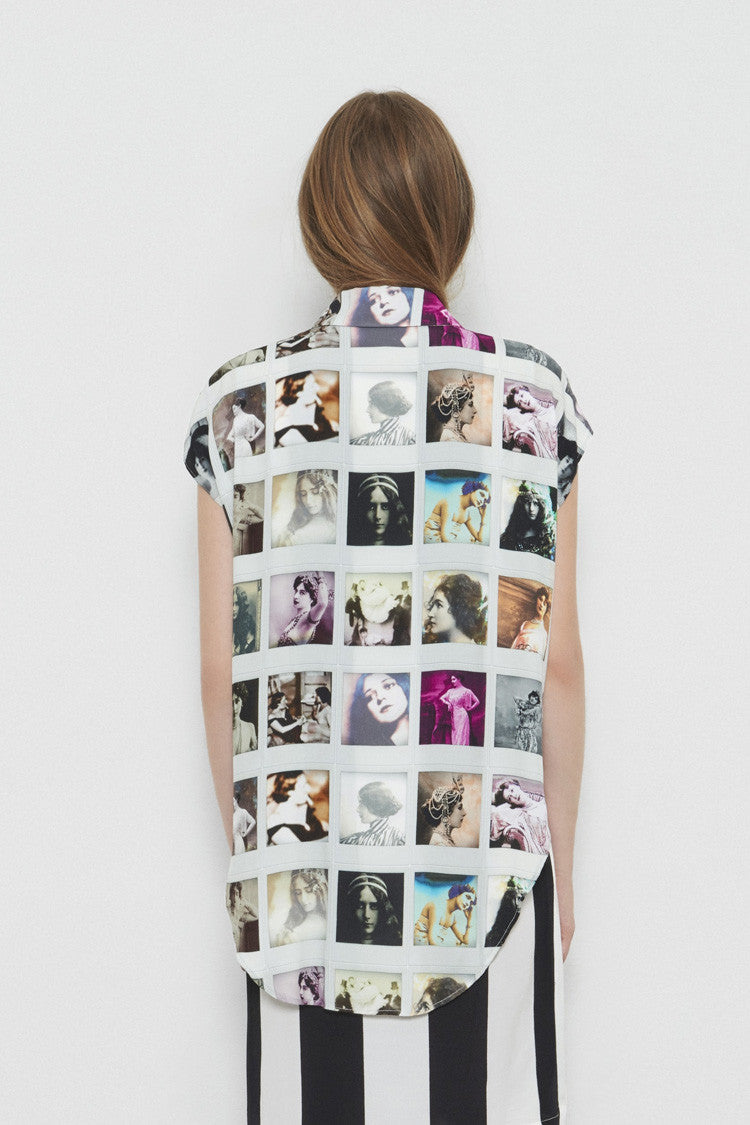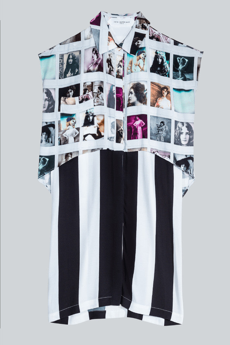 Liane shirt dress. Superposition of “Courtisanes & Polaroïde” print and “Bayadères” print.