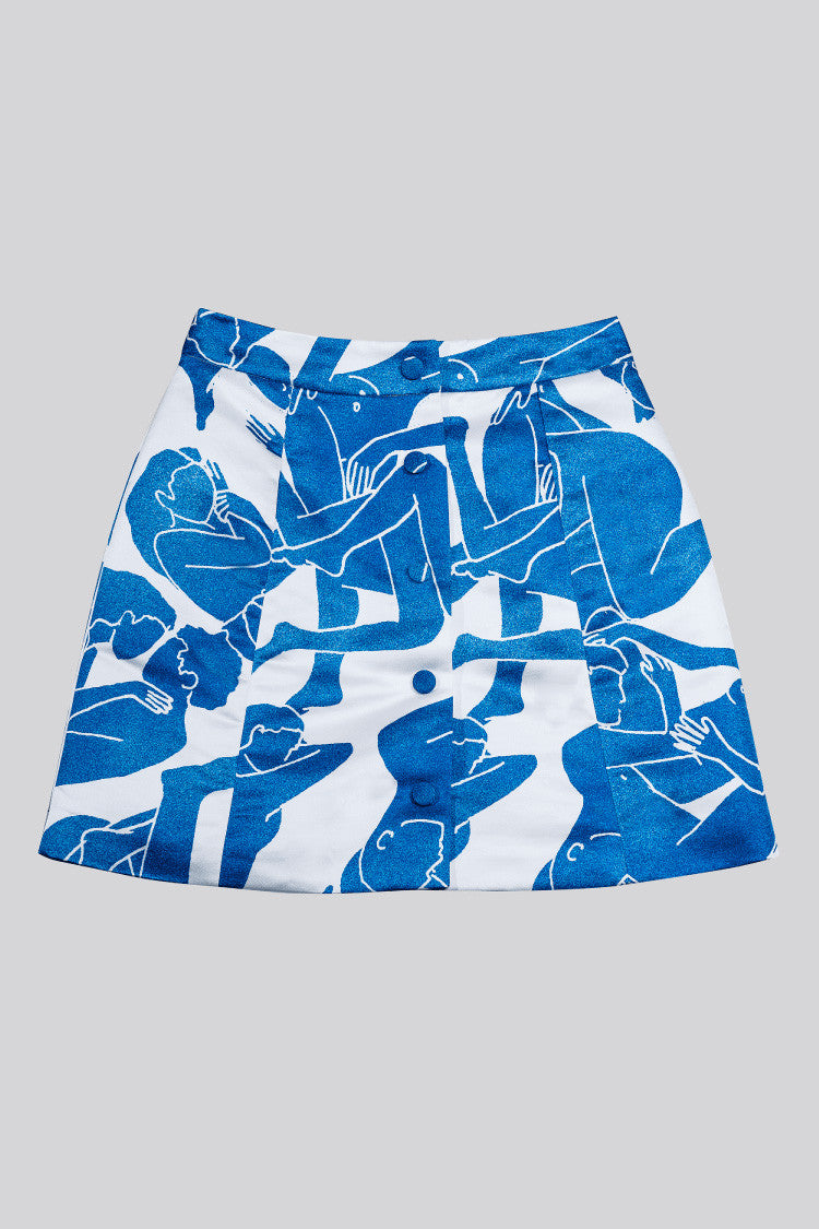 Léa is wearing Orbiane with the Faust white cropped top and the Frida jacket in “Géants bleus” print.